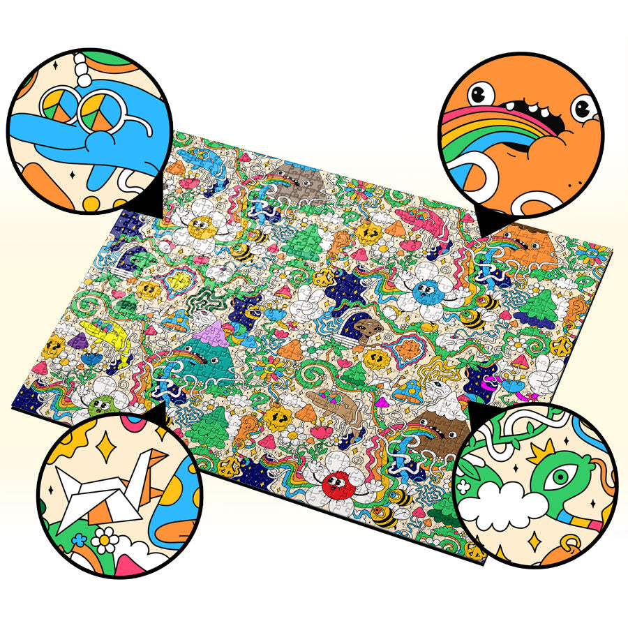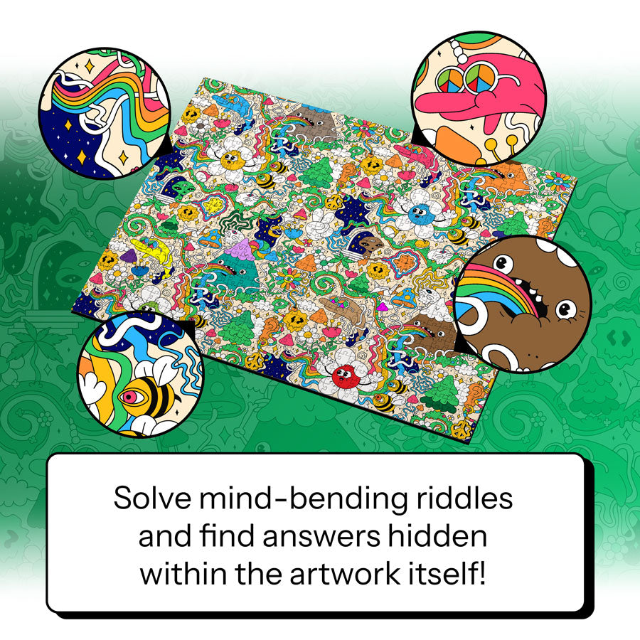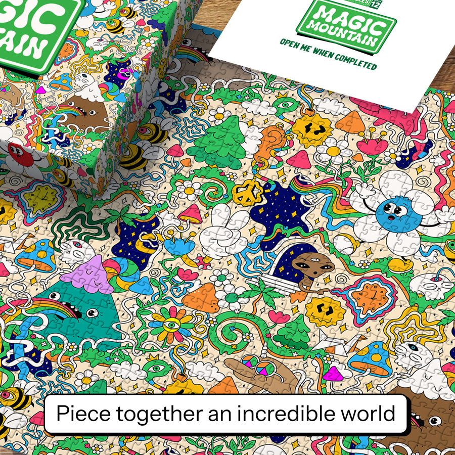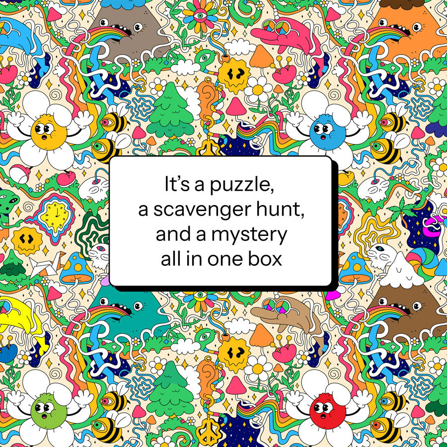 Magic Mountain is a 1000-piece psychedelic paradise bursting with colour, chaos, and cosmic charm. Bees buzz past smiling flowers, mountains blow rainbows, and peace signs float through candy-coloured skies. Once the last piece clicks into place, open your secret envelope to reveal 30 mind-bending riddles that lead you to hidden easter eggs tucked inside the artwork.