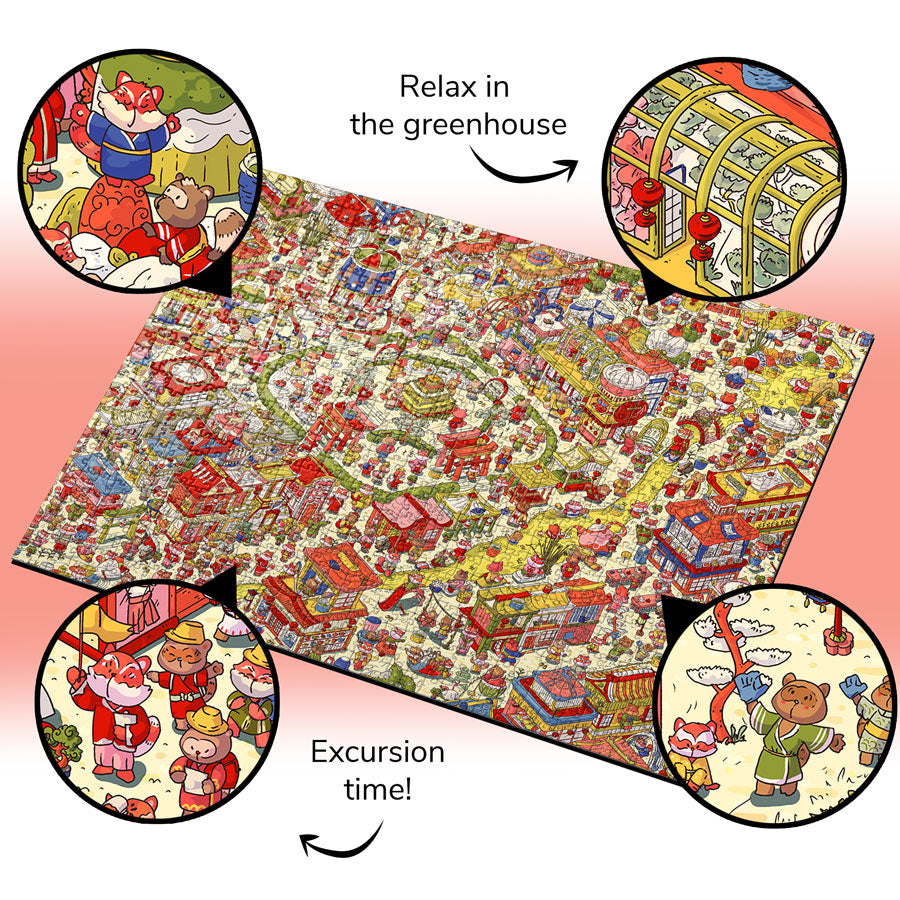 Tanuki Town is a 1000-piece celebration of comfort and mischief, where playful raccoon spirits (tanuki!) bustle through a hand-painted world of steaming ramen shops, paper lanterns, and secret shortcuts.