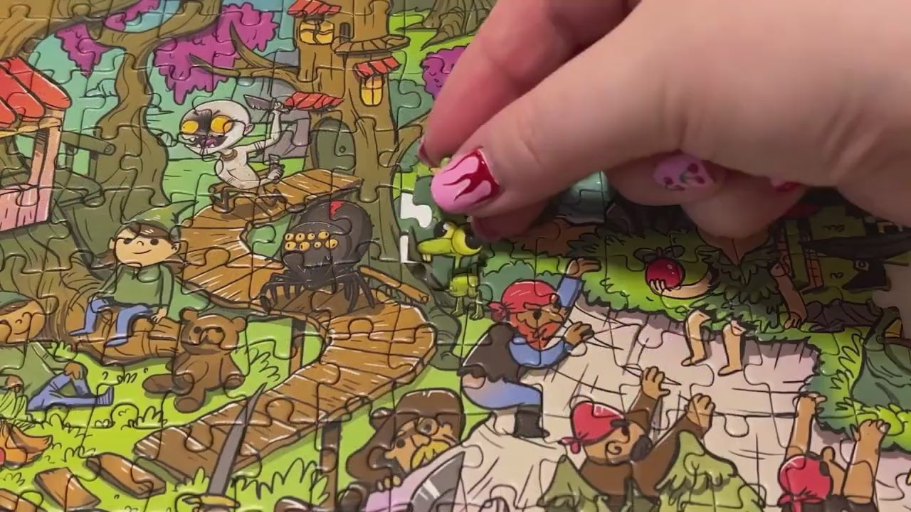 • Our wondrously whimsical puzzles are illustrated by Samuel Milham, an Australian artist who creates all of the amazing products on our site. We know you'll enjoy diving into each little world that he builds with each new title.