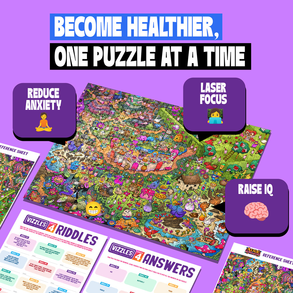 Solve 30 mind-bending riddles, locate the answers on the artwork and explore each mini world! Unlock a timed search-and-find challenge with each puzzle.